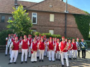 Am Sonntag den 20.07.2025 waren wir zum großen Festumzug nach Eissen eingeladen. Bei strahlendem Sonnenschein durften wir den Festumzug begleiten. Nach dem Festumzug spielten wir nach einer kleinen Pause in der Halle das Königspaar und den Hofstaat zum Fotoshooting und anschließend zum Tennisheim. Dort wurden wir zu einem geselligen Abend eingeladen, wo wir es uns natürlich nicht nehmen ließen, ein paar Stimmungshits zu spielen. Leider hatte das Wetter es am Abend nicht mehr zugelassen das Königspaar samt Hofstaat wieder mit in die Halle zu geleiten.