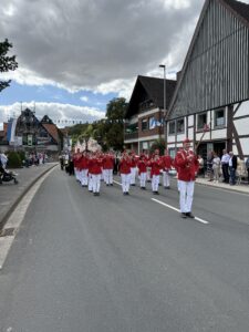 Am 24.08.2025 waren wir zu Gast auf dem Bezirksschützenfest in Dalhausen. Hierzu starteten wir auf dem Sportplatz, wo zu Beginn eine Festansprache gehalten wurde. Anschließend startete der Festumzug  mit 9 weiteren Musiken und etwa 25 geladenen Vereinen, dementsprechend war der Umzug besonders groß. Nach dem Umzug maschierten wir ins Festzelt ein und machten mit unseren befreundeten Vereinen Borgholz und Auenhausen draußen noch etwas Stimmung.